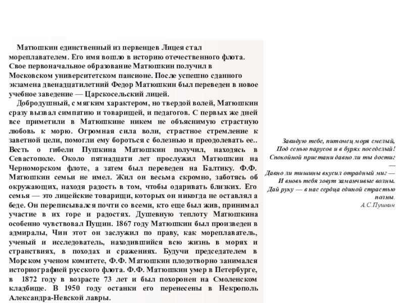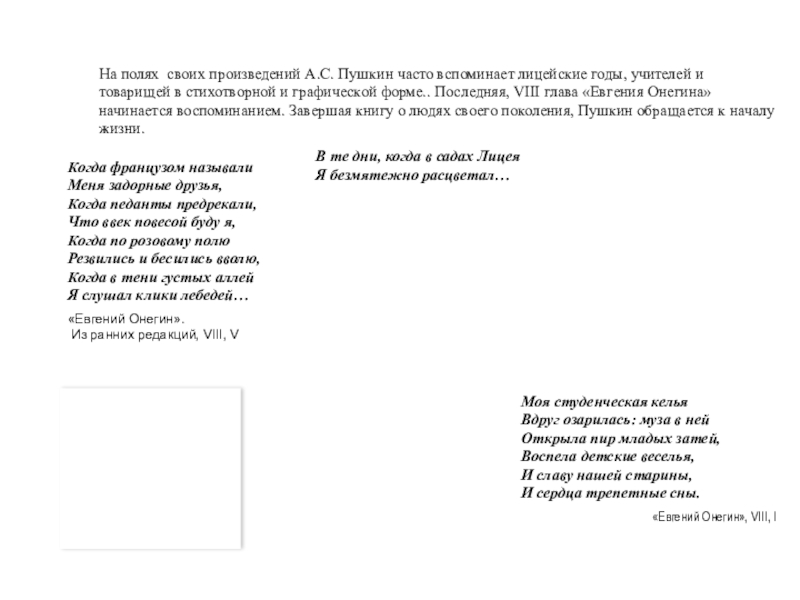 Лицей подарил А.С. Пушкину красоту мира, любовь к родине, к друзьям, с некоторыми из них соединив навсегда. Все это наполняло душу Пушкина светлым и радостным чувством, которое не угасало и через годы. Вспоминая свою лицейскую юность, он писал: