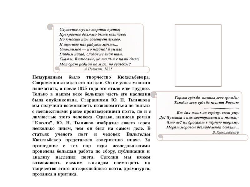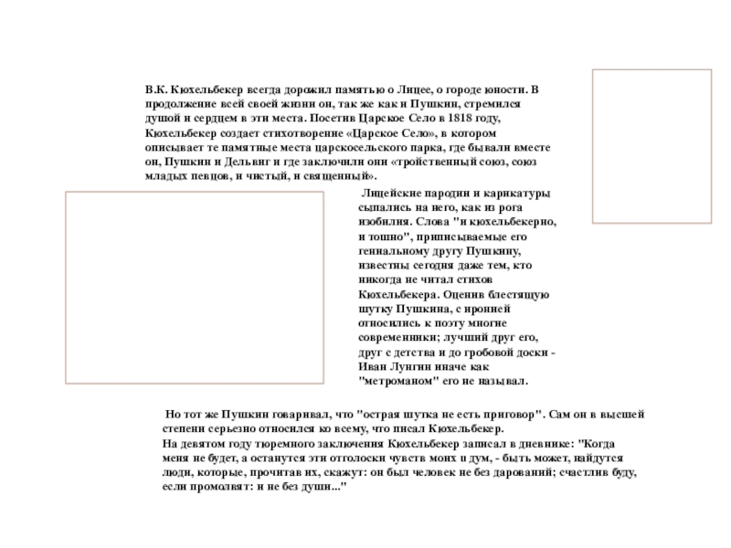 Но тот же Пушкин говаривал, что "острая шутка не есть приговор". Сам он в высшей степени серьезно относился ко всему, что писал Кюхельбекер.