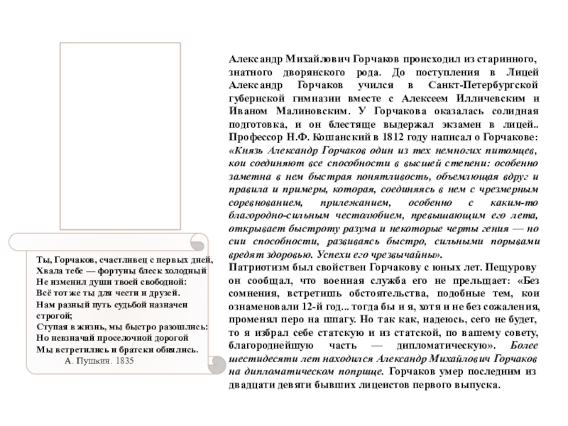 Горчаков собирал и бережно хранил среди своих бумаг лицейские стихи и эпиграммы в том числе и произведения Пушкина. Еще в Лицее Горчаков был страстным приверженцем русского языка и родной литературы. Своему влиятельному дядюшке А.И.Пещурову Горчаков писал из Лицея, что, хотя и любит французский язык, но не столь «ослеплен» им, чтобы не чувствовать всех достоинств русского языка «сильнейшего», «благозвучнейшего», «богатейшего».