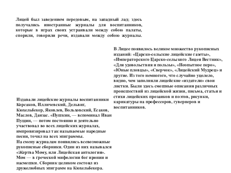 Издавали лицейские журналы воспитанники Корсаков, Илличевский, Дельвиг, Кюхельбекер, Яковлев, Вольховский, Есаков, Маслов, Данзас. «Пушкин, — вспоминал Иван Пущин, — потом постоянно и деятельно участвовал во всех лицейских журналах, импровизировал так называемые народные песни, точил на всех эпиграммы.