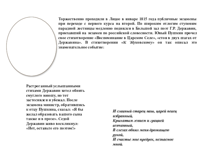 Растроганный услышанными стихами Державин хотел обнять смуглого юношу, но тот застеснялся и убежал. После экзамена министр, обратившись к отцу Пушкина, сказал: «Я бы желал образовать вашего сына также и в прозе». Седой Державин живо воскликнул: «Нет, оставьте его поэтом!»