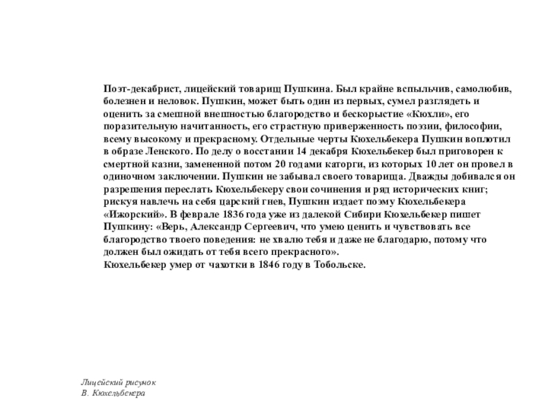 Лицейские пародии и карикатуры сыпались на него, как из рога изобилия. Слова "и кюхельбекерно, и тошно", приписываемые его гениальному другу Пушкину, известны сегодня даже тем, кто никогда не читал стихов Кюхельбекера. Оценив блестящую шутку Пушкина, с иронией относились к поэту многие современники; лучший друг его, друг с детства и до гробовой доски - Иван Лунгин иначе как "метроманом" его не называл.