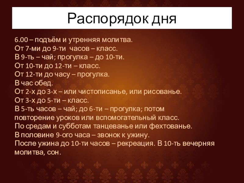 В 5-ть часов – чай; до 6-ти – прогулка; потом