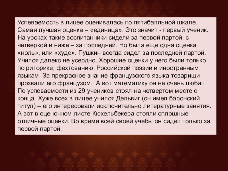 «единица». Это значит - первый ученик. На уроках такие воспитанники сидели за первой партой, с четверкой и ниже – за последней. Но была еще одна оценка «ноль», или «худо». Пушкин всегда сидел за последней партой. Учился далеко не усердно. Хорошие оценки у него были только по риторике, фехтованию, Российской поэзии и иностранным языкам. За прекрасное знание французского языка товарищи прозвали его французом. А вот математику он не очень любил. По успеваемости из 29 учеников стоял на четвертом месте с конца. Хуже всех в лицее учился Дельвиг (он имел баронский титул) – его интересовали исключительно литературные занятия. А вот в оценочном листе Кюхельбекера стояли сплошные отличные оценки. Во время всей своей учебы он сидел только за первой партой.