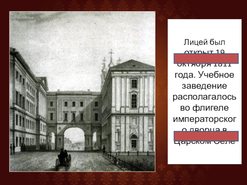 Слайд 2Лицей был открыт 19 октября 1811 года. Учебное заведение располагалось