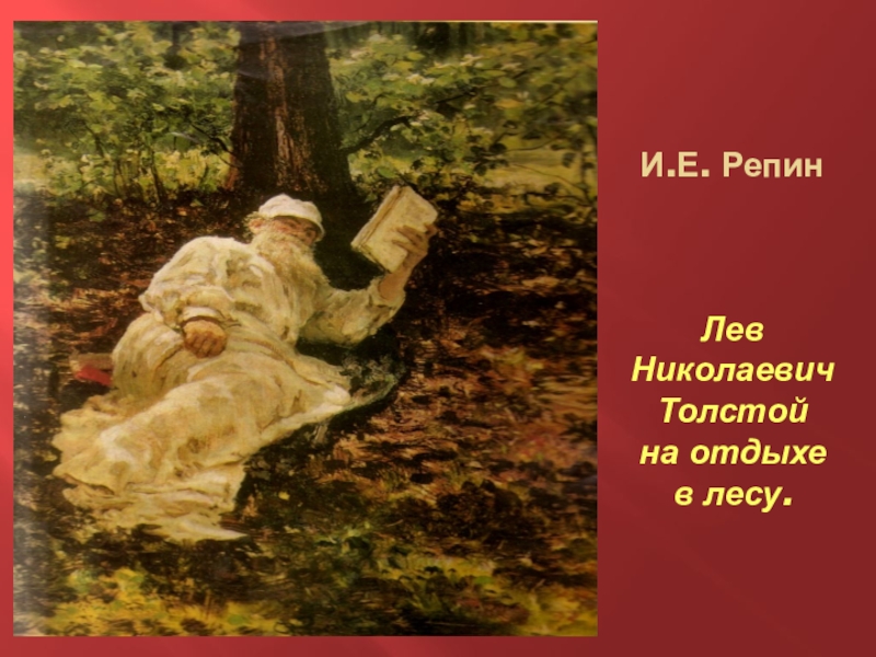 Слайд 6И.Е. Репин Лев Николаевич Толстой на отдыхе в лесу.