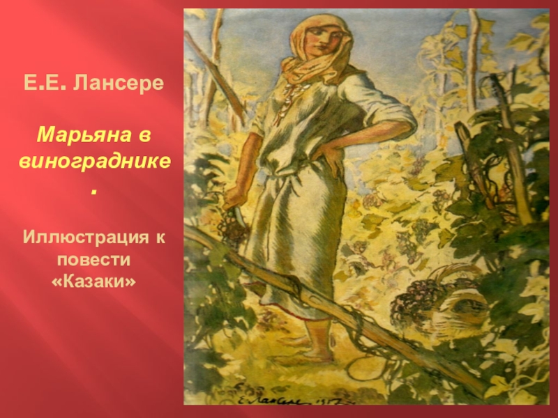 Слайд 10Е.Е. Лансере Марьяна в винограднике. Иллюстрация к повести «Казаки»