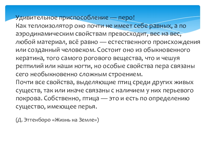1) Почти все свойства, отличающие птиц от других существ, связаны с наличием у них перьевого покрова, потому что перо — уникальное приспособление, не имеющее равных по целому ряду параметров.