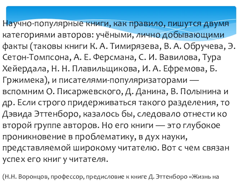 факты (таковы книги К. А. Тимирязева, В. А. Обручева, Э. Сетон-Томпсона, А. Е. Ферсмана, С. И. Вавилова, Тура Хейердала, Н. Н. Плавильщикова, И. А. Ефремова, Б. Гржимека), и писателями-популяризаторами — вспомним О. Писаржевского, Д. Данина, В. Полынина и др. Если строго придерживаться такого разделения, то Дэвида Эттенборо, казалось бы, следовало отнести ко второй группе авторов. Но его книги — это глубокое проникновение в проблематику, в дух науки, представляемой широкому читателю. Вот с чем связан успех его книг у читателя.