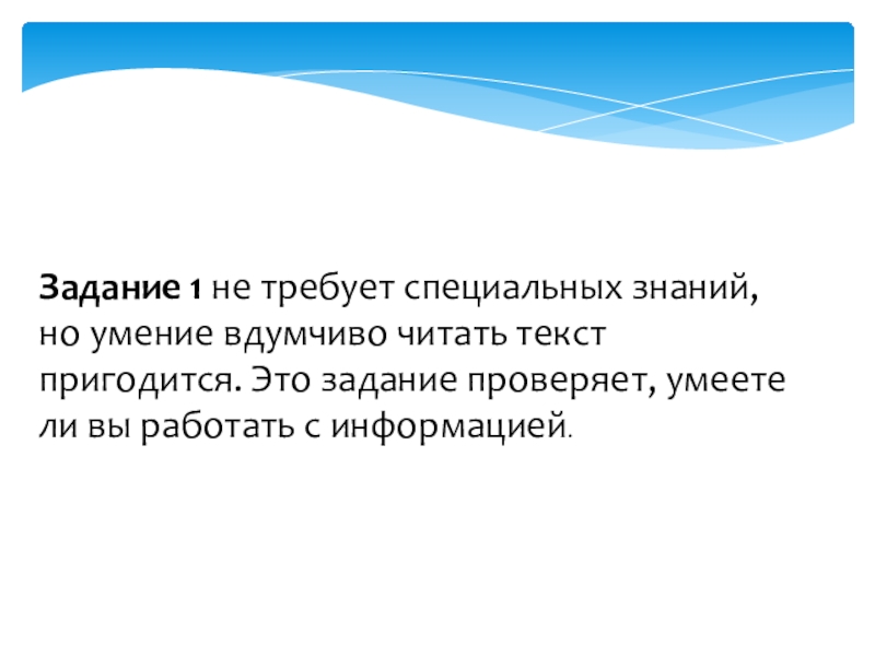 Слайд 3Задание 1 не требует специальных знаний, но умение вдумчиво читать текст пригодится.
