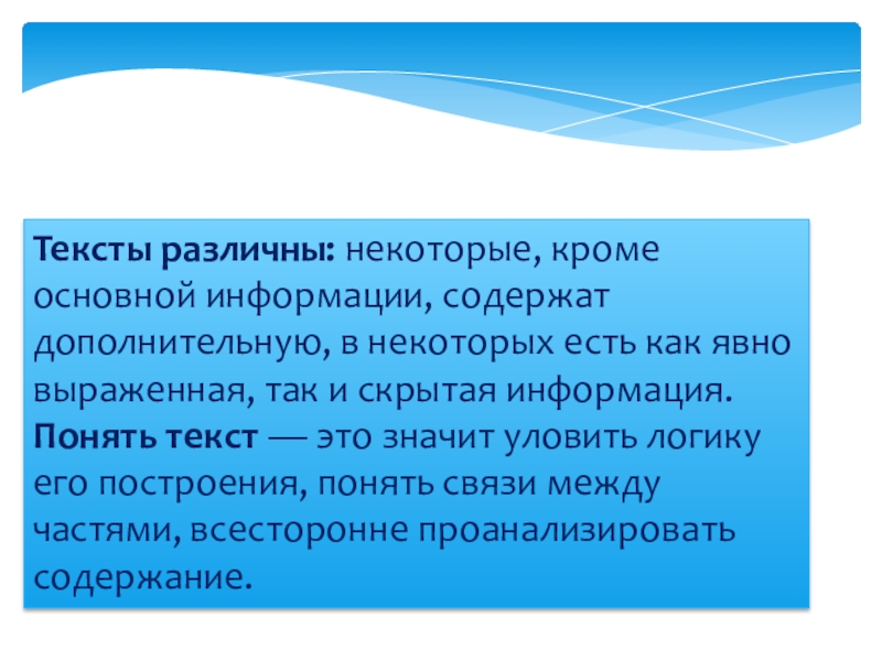 как явно выраженная, так и скрытая информация. Понять текст — это значит уловить логику его построения, понять связи между частями, всесторонне проанализировать содержание.