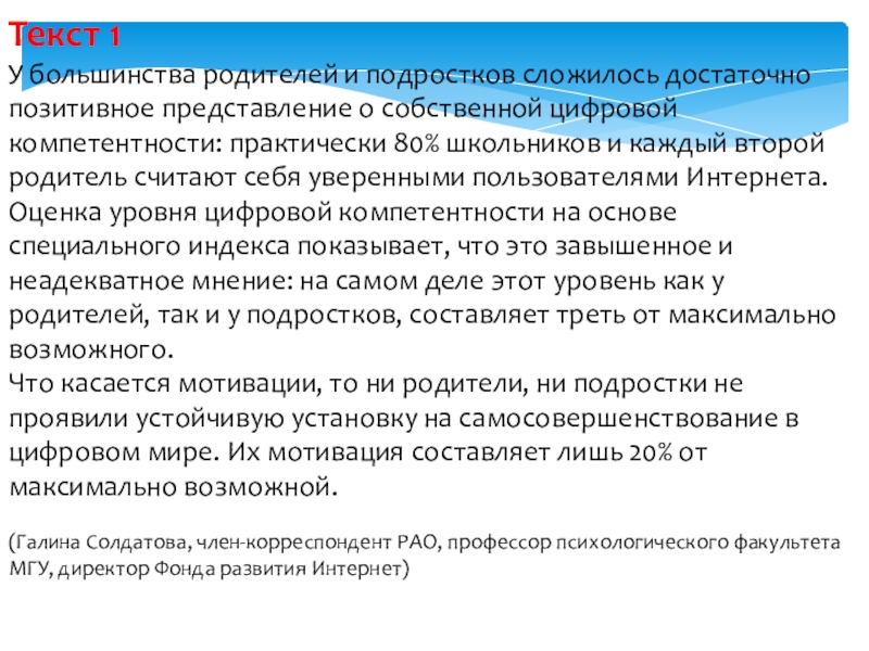 собственной цифровой компетентности: практически 80% школьников и каждый второй родитель считают себя уверенными пользователями Интернета. Оценка уровня цифровой компетентности на основе специального индекса показывает, что это завышенное и неадекватное мнение: на самом деле этот уровень как у родителей, так и у подростков, составляет треть от максимально возможного.