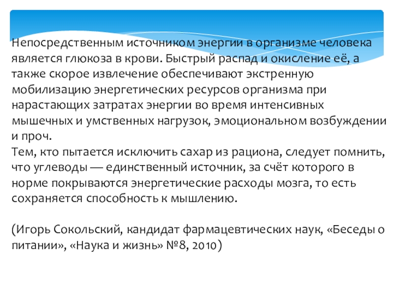 Тем, кто пытается исключить сахар из рациона, следует помнить, что углеводы — единственный источник, за счёт которого в норме покрываются энергетические расходы мозга, то есть сохраняется способность к мышлению.