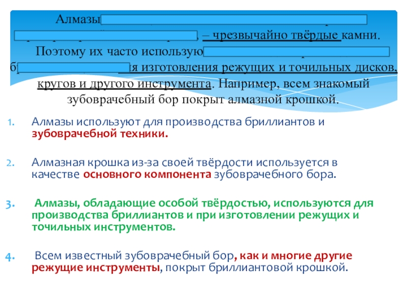 Слайд 11Алмазы используют для производства бриллиантов и зубоврачебной техники.