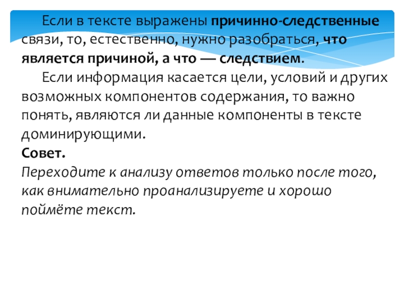 Слайд 9 Если в тексте выражены причинно-следственные связи, то, естественно, нужно разобраться, что
