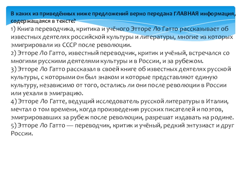 4) Этторе Ло Гатте, ведущий исследователь русской литературы в Италии, мечтал о том времени, когда произведения русских писателей и поэтов, эмигрировавших за рубеж после революции, разрешат издавать на родине.