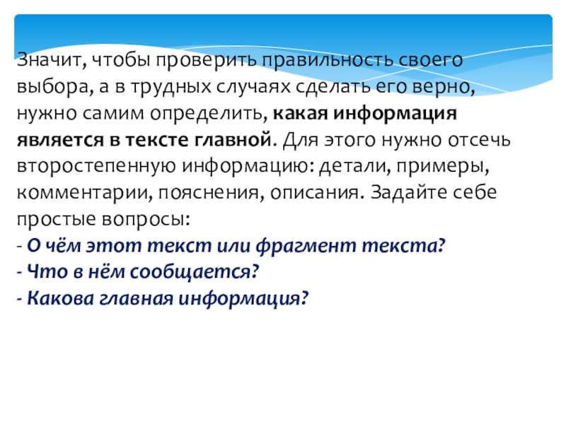 его верно, нужно самим определить, какая информация является в тексте главной. Для этого нужно отсечь второстепенную информацию: детали, примеры, комментарии, пояснения, описания. Задайте себе простые вопросы: