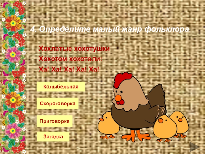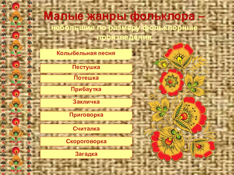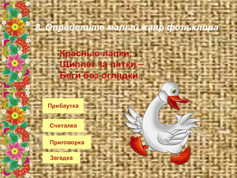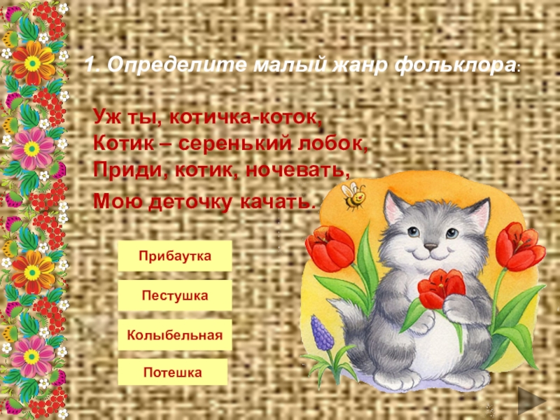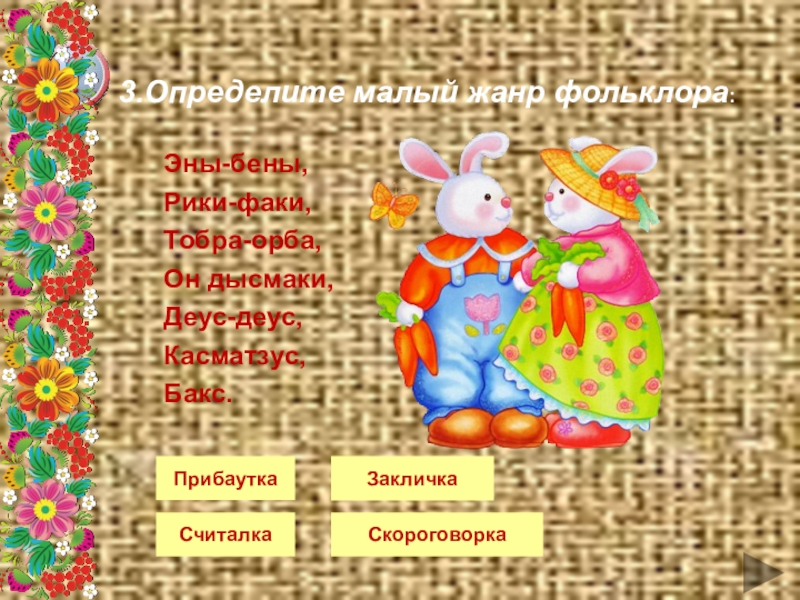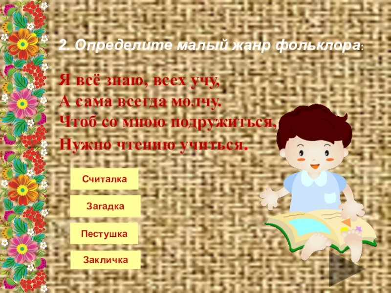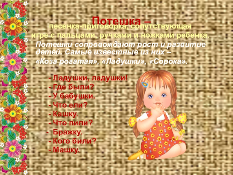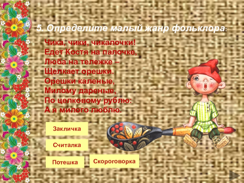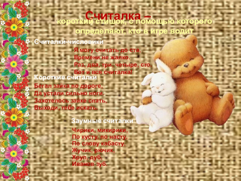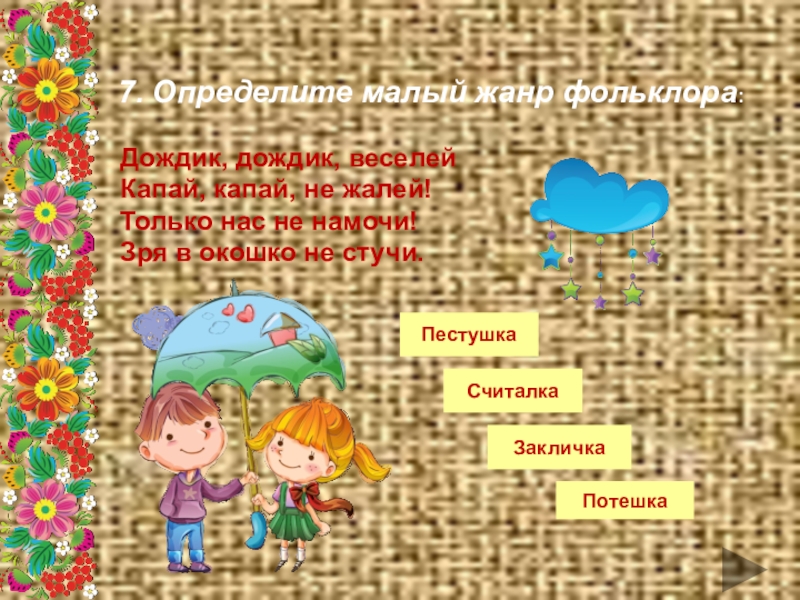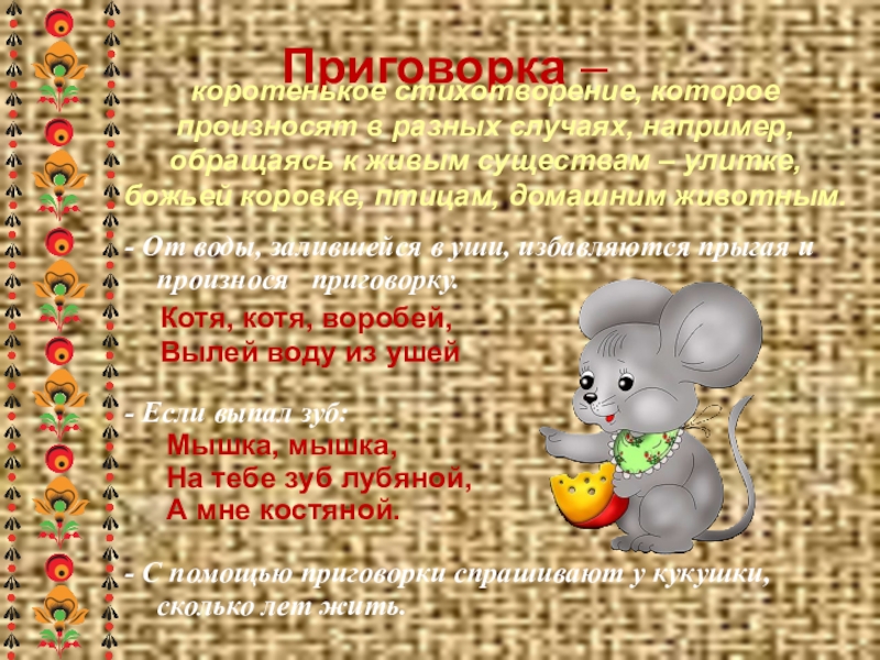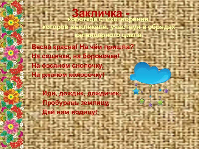 коротенькое стихотворение, которое произносят в разных случаях, например, обращаясь к живым существам – улитке, божьей коровке, птицам, домашним животным.