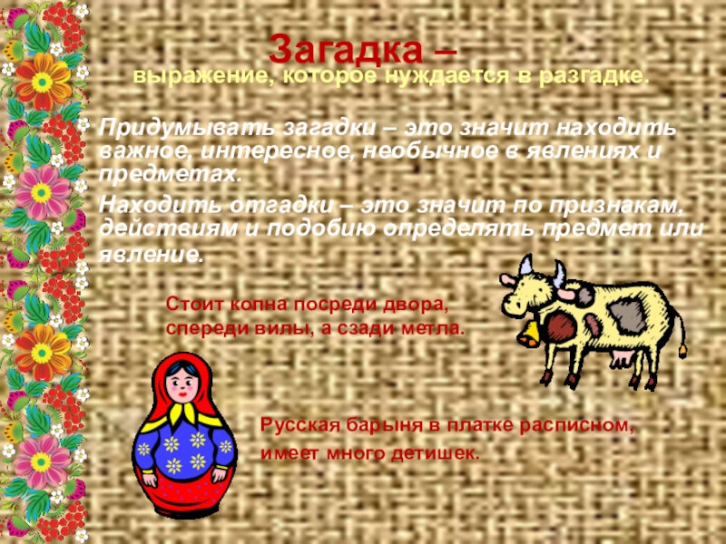 Находить отгадки – это значит по признакам, действиям и подобию определять предмет или явление.