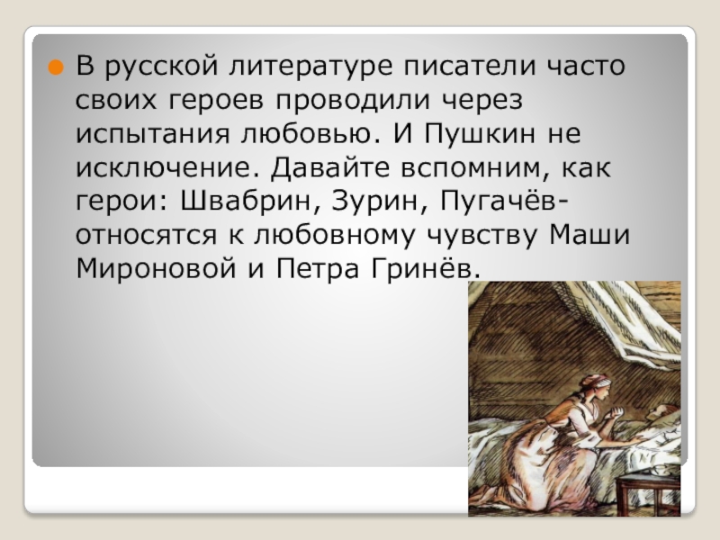 И Пушкин не исключение. Давайте вспомним, как герои: Швабрин, Зурин, Пугачёв- относятся к любовному чувству Маши Мироновой и Петра Гринёв.