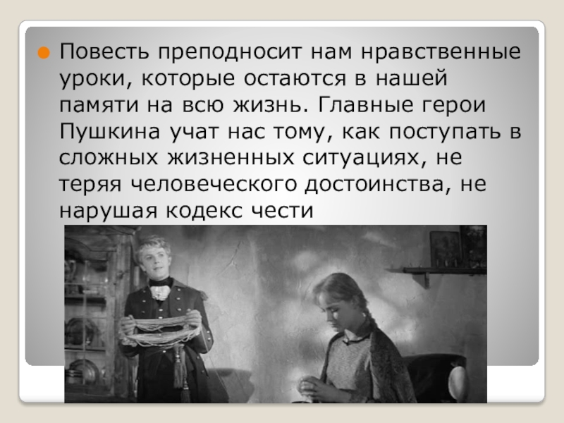 Слайд 22Повесть преподносит нам нравственные уроки, которые остаются в нашей памяти на