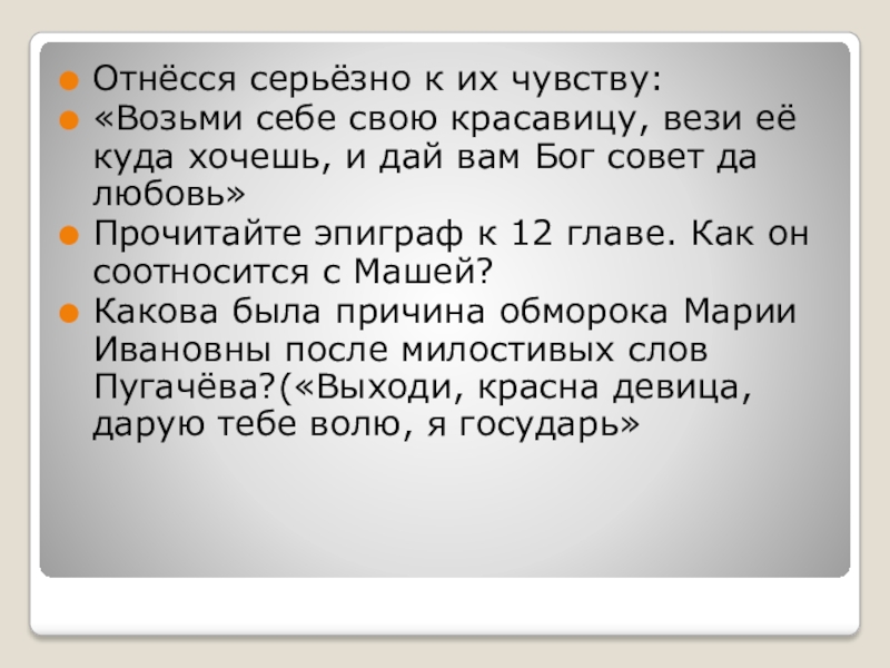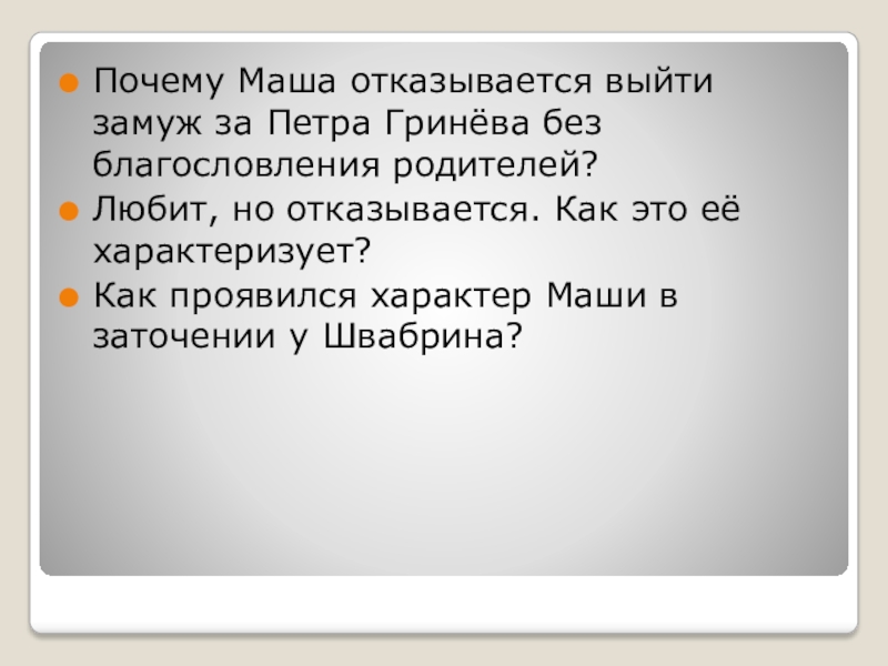 Слайд 8Почему Маша отказывается выйти замуж за Петра Гринёва без благословления родителей?