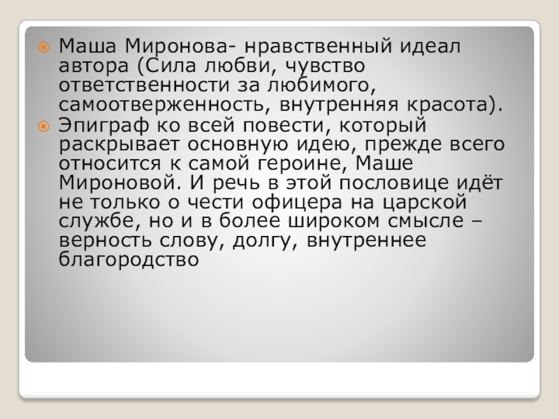 Слайд 18Маша Миронова- нравственный идеал автора (Сила любви, чувство ответственности за любимого,