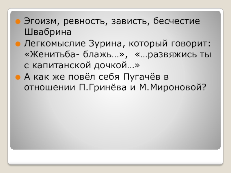 Слайд 13Эгоизм, ревность, зависть, бесчестие Швабрина