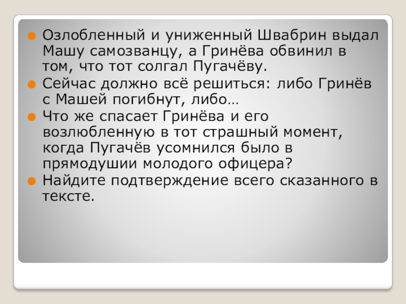 Слайд 11Озлобленный и униженный Швабрин выдал Машу самозванцу, а Гринёва обвинил в