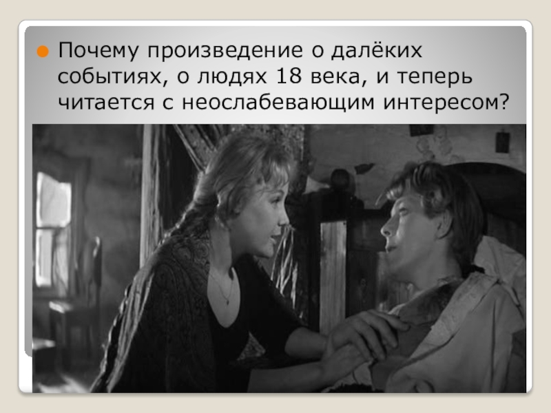 Слайд 21Почему произведение о далёких событиях, о людях 18 века, и теперь
