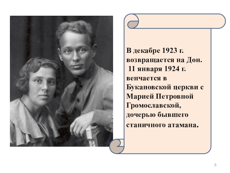 венчается в Букановской церкви с Марией Петровной Громославской, дочерью бывшего станичного атамана.