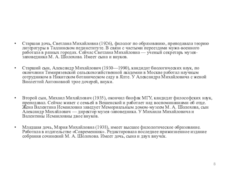в Таллинском пединституте. В связи с частыми переездами мужа-военного работала в разных городах. Сейчас Светлана Михайловна — ученый секретарь музея-заповедника М. А. Шолохова. Имеет сына и внуков.