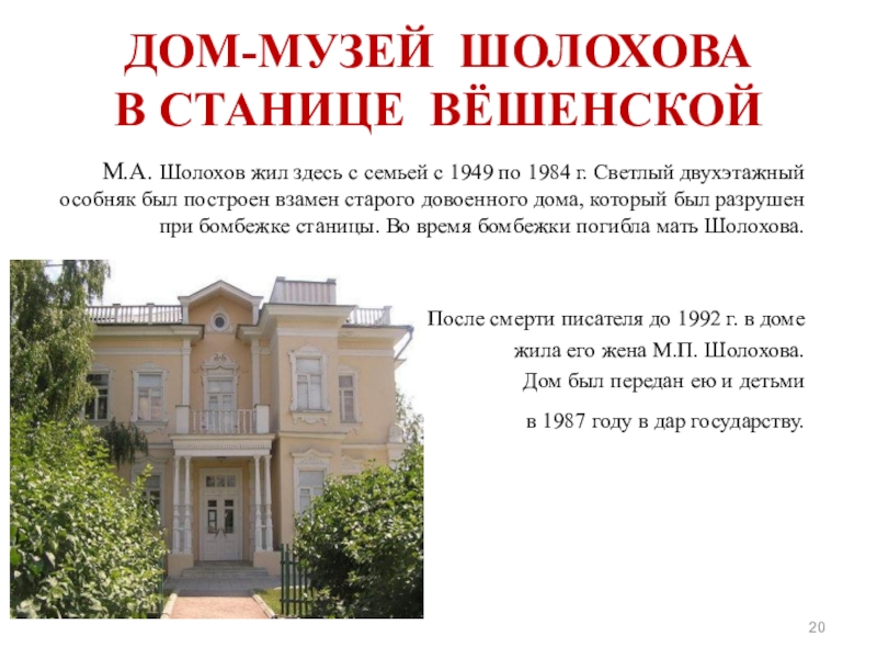 1949 по 1984 г. Светлый двухэтажный особняк был построен взамен старого довоенного дома, который был разрушен при бомбежке станицы. Во время бомбежки погибла мать Шолохова.