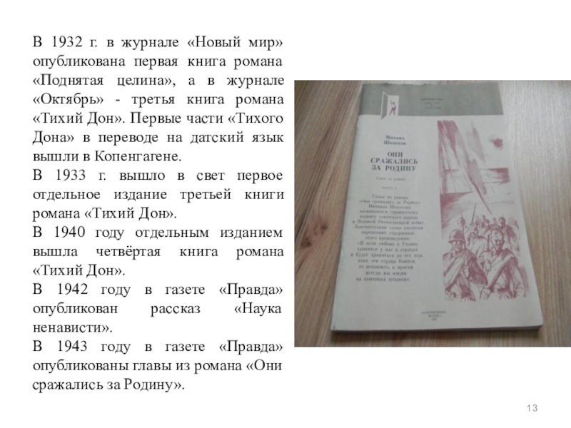 «Поднятая целина», а в журнале «Октябрь» - третья книга романа «Тихий Дон». Первые части «Тихого Дона» в переводе на датский язык вышли в Копенгагене.