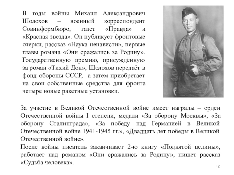 Слайд 10В годы войны Михаил Александрович Шолохов – военный корреспондент Совинформбюро, газет