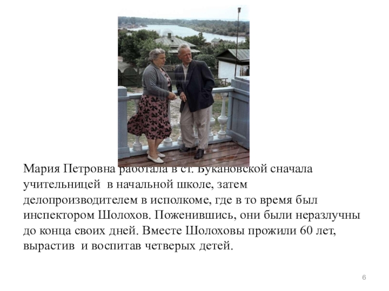 затем делопроизводителем в исполкоме, где в то время был инспектором Шолохов. Поженившись, они были неразлучны до конца своих дней. Вместе Шолоховы прожили 60 лет, вырастив и воспитав четверых детей.
