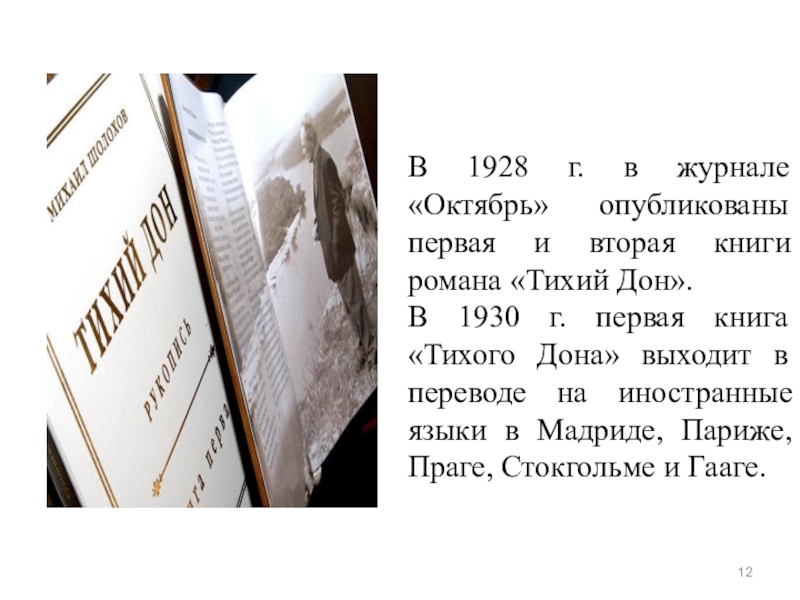 В 1930 г. первая книга «Тихого Дона» выходит в переводе на иностранные языки в Мадриде, Париже, Праге, Стокгольме и Гааге.