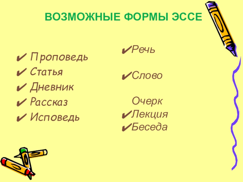 Слайд 8ВОЗМОЖНЫЕ ФОРМЫ ЭССЕ