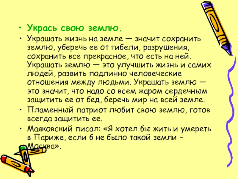 ее от гибели, разрушения, сохранить все прекрасное, что есть на ней. Украшать землю — это улучшить жизнь и самих людей, развить подлинно человеческие отношения между людьми. Украшать землю — это значит, что надо со всем жаром сердечным защитить ее от бед, беречь мир на всей земле.