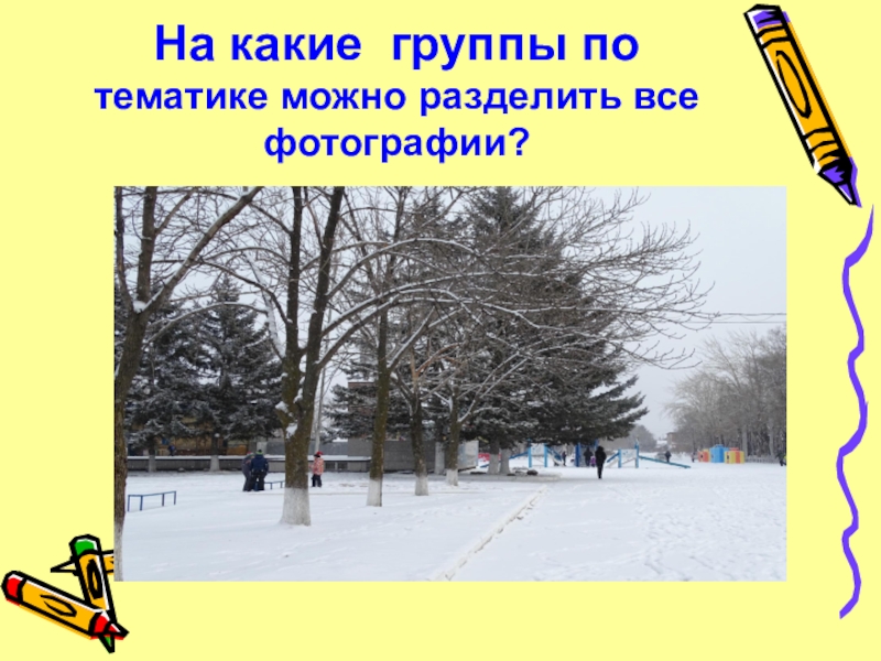 Слайд 29На какие группы по тематике можно разделить все фотографии?