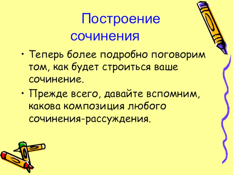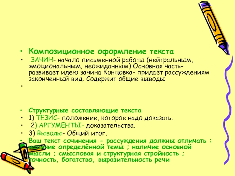 Ваш текст сочинения - рассуждения должны отличать : наличие определённой темы ; наличие основной мысли ; смысловая и структурная стройность ; точность, богатство, выразительность речи