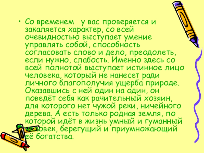 очевидностью выступает умение управлять собой, способность согласовать слово и дело, преодолеть, если нужно, слабость. Именно здесь со всей полнотой выступает истинное лицо человека, который не нанесет ради личного благополучия ущерба природе. Оказавшись с ней один на один, он поведёт себя как рачительный хозяин, для которого нет чужой реки, ничейного дерева. А есть только родная земля, по которой идёт в жизнь умный и гуманный человек, берегущий и приумножающий её богатства.