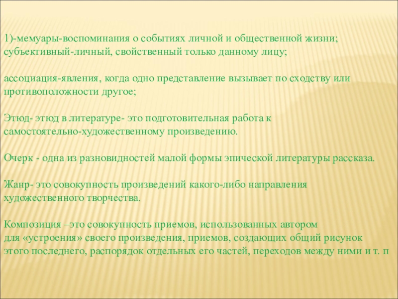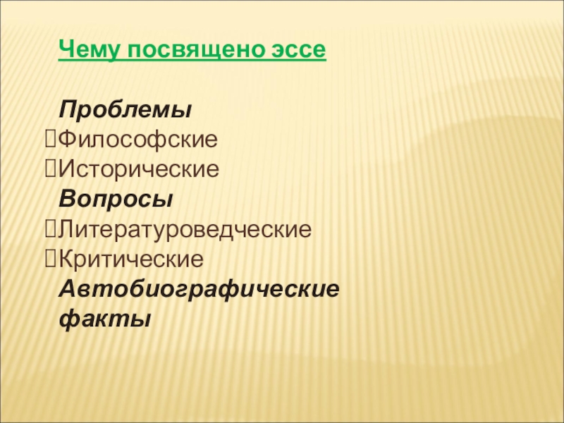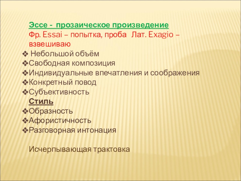Эссе-разновидность очерка, в которой главную роль играет не воспроизхведение факта,