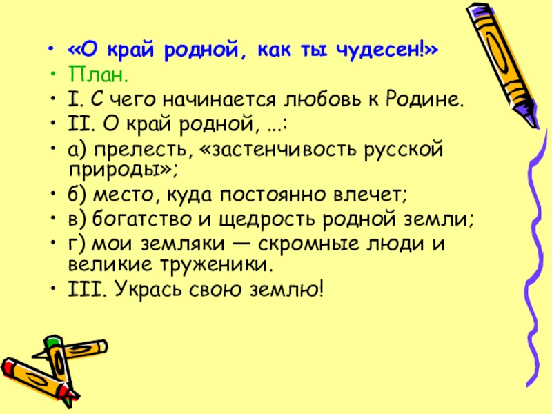 мы будем говорить о ее величии, пространстве, красоте, богатстве. А какую мысль мы будем доказывать этим? Зачем бы обо всем этом будем писать? Какое чувство мы постараемся выразить, описывая свою Родину, край или село?