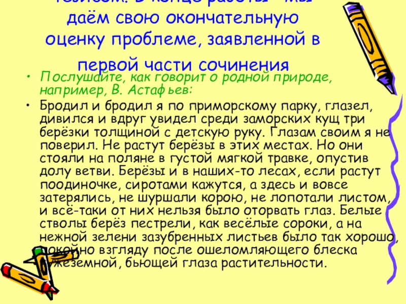 Паустовский мечтал дожить до ста двадцати лет только потому, «что мало одной жизни, чтобы испытать до конца всё очарование и всю исцеляющую силу нашей русской природы». Наша русская природа, полная поэзии и прелести, трогает и волнует каждого человека, любящего свою Родину. Чем ближе человек к природе, тем богаче, образнее, ярче его язык.