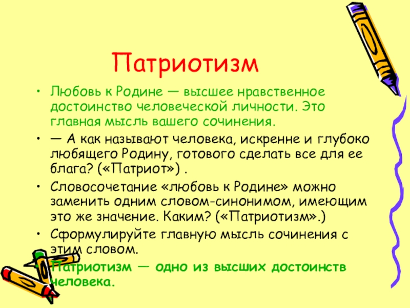 Словосочетание «любовь к Родине» можно заменить одним словом-синонимом, имеющим это же значение. Каким? («Патриотизм».)