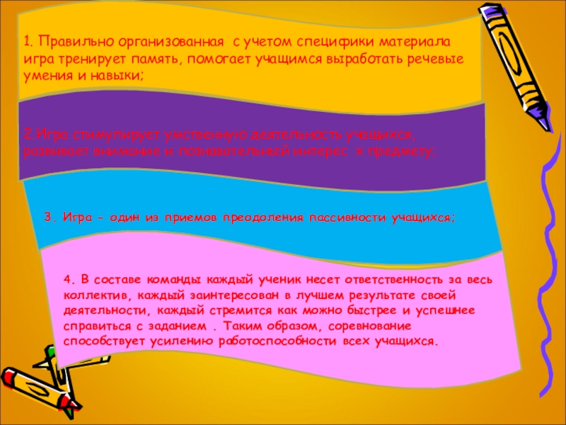 4. В составе команды каждый ученик несет ответственность за весь коллектив, каждый заинтересован в лучшем результате своей деятельности, каждый стремится как можно быстрее и успешнее справиться с заданием . Таким образом, соревнование способствует усилению работоспособности всех учащихся.