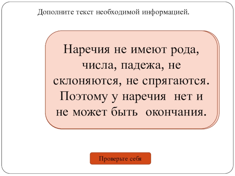 Наречия не имеют рода, числа, падежа, не склоняются, не спрягаются. Поэтому у наречия нет и не может быть окончания.