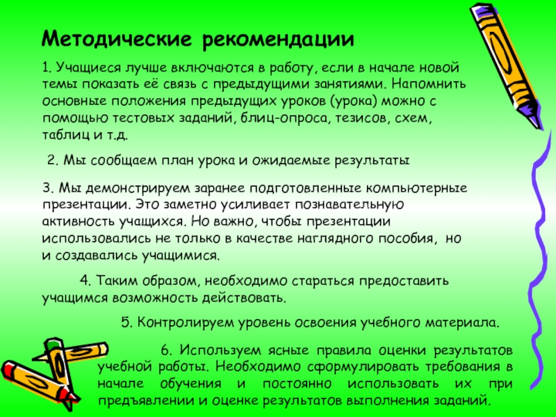 6. Используем ясные правила оценки результатов учебной работы. Необходимо сформулировать требования в начале обучения и постоянно использовать их при предъявлении и оценке результатов выполнения заданий.