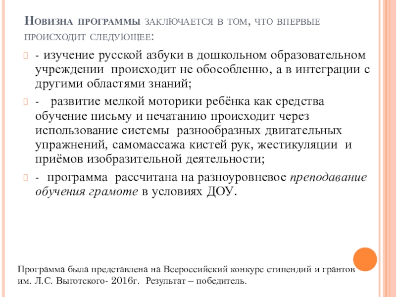 Программа была представлена на Всероссийский конкурс стипендий и грантов им. Л.С. Выготского- 2016г. Результат – победитель.